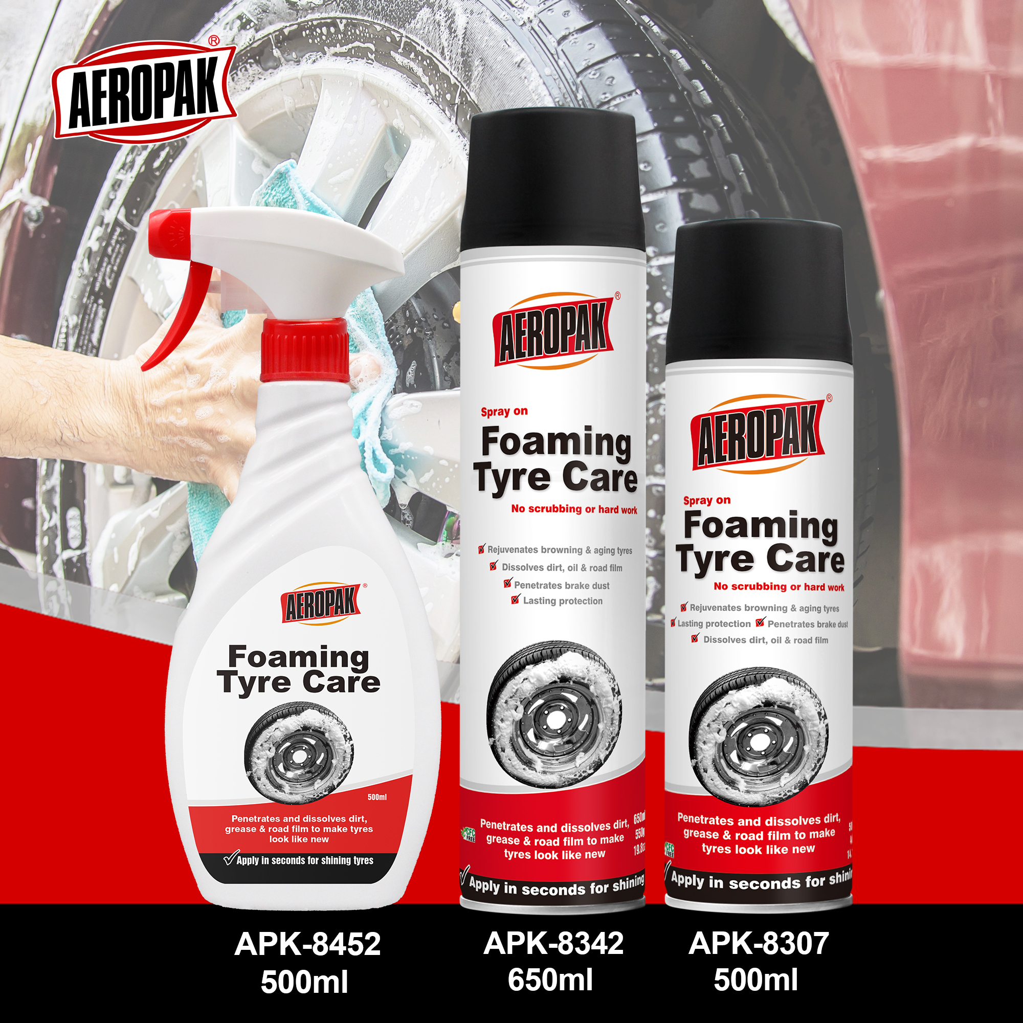 Aeropak Foaming Tire Care enthält einen Makromolekülbestandteil, der durchdringt, um Schmutz, Bremsstaub, Schmutz, Film und Fett zu entfernen.Diese spezielle Formel schützt langlebig und verjüngt braune und alte Reifen, so dass ein fleckfreies Finish bleibt.